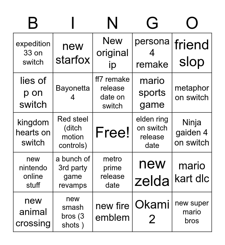 This bingo card has a free space and 24 words: a bunch of 3rd party game revamps, new smash bros (3 shots ), ff7 remake release date on switch, new animal crossing, friend slop, expedition 33 on switch, lies of p on switch, new starfox, elden ring on switch release date, metro prime release date, mario sports game, kingdom hearts on switch, new zelda, mario kart dlc, Bayonetta 4, Okami 2, Ninja gaiden 4 on switch, New original ip, metaphor on switch, Red steel (ditch motion controls), new super mario bros, new nintendo online stuff, persona 4 remake and new fire emblem.
