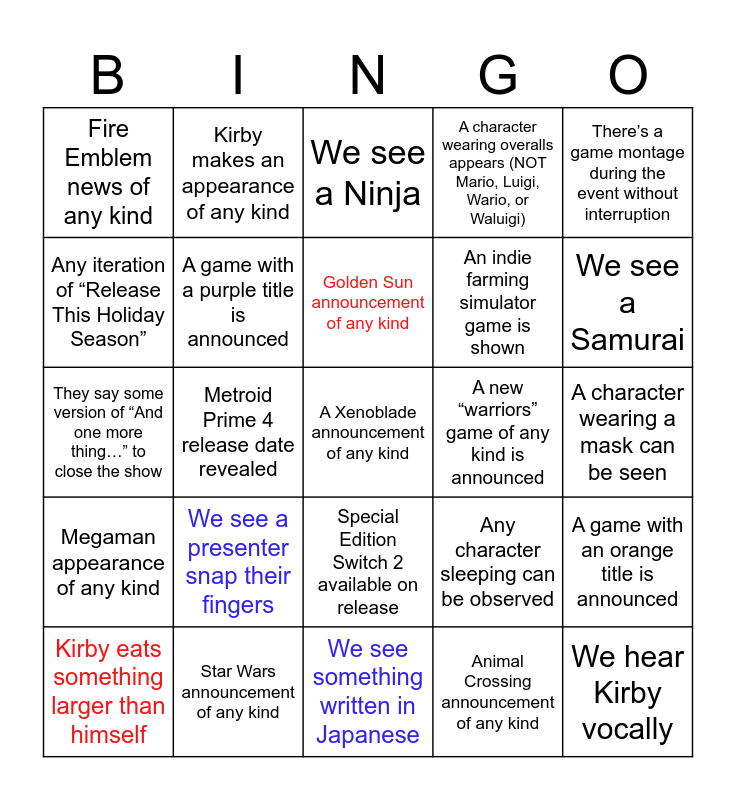 This bingo card has 25 words: We see a presenter snap their fingers, We see something written in Japanese, Golden Sun announcement of any kind, Kirby eats something larger than himself, There’s a game montage during the event without interruption, Fire Emblem news of any kind, Any iteration of “Release This Holiday Season”, Kirby makes an appearance of any kind, A new “warriors” game of any kind is announced, Special Edition Switch 2 available on release, An indie farming simulator game is shown, They say some version of “And one more thing…” to close the show, Any character sleeping can be observed, A game with an orange title is announced, A game with a purple title is announced, We hear Kirby vocally, A character wearing a mask can be seen, We see a Ninja, We see a Samurai, Metroid Prime 4 release date revealed, A Xenoblade announcement of any kind, Star Wars announcement of any kind, Megaman appearance of any kind, A character wearing overalls appears (NOT Mario, Luigi, Wario, or Waluigi) and Animal Crossing announcement of any kind.
