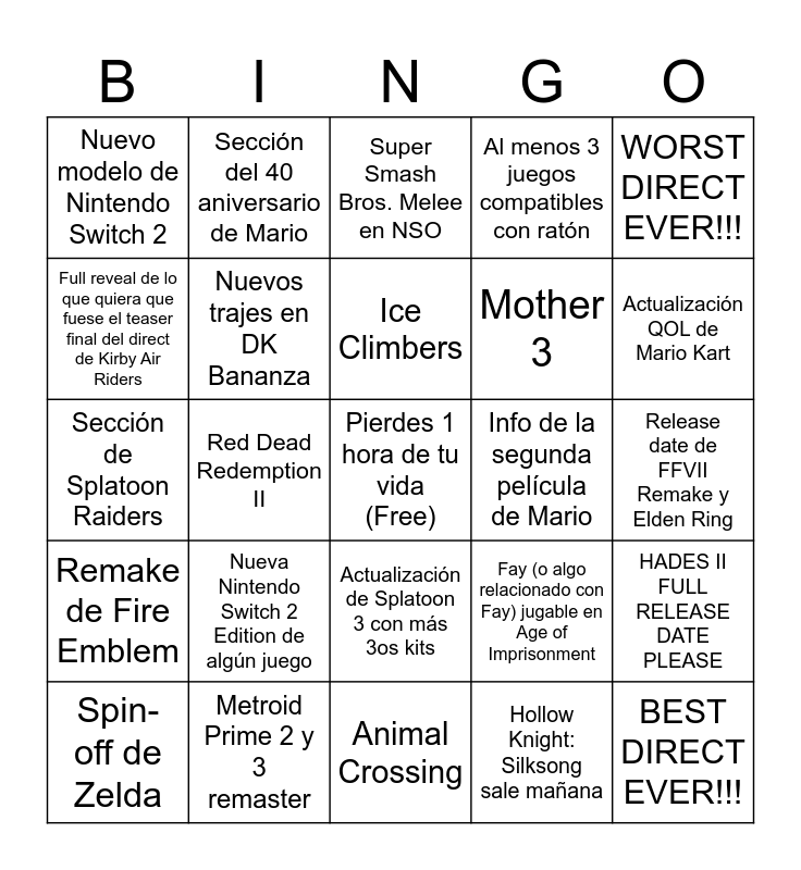This bingo card has a free space and 24 words: Nueva Nintendo Switch 2 Edition de algún juego, Metroid Prime 2 y 3 remaster, Ice Climbers, Spin-off de Zelda, WORST DIRECT EVER!!!, Nuevo modelo de Nintendo Switch 2, Full reveal de lo que quiera que fuese el teaser final del direct de Kirby Air Riders, Sección del 40 aniversario de Mario, Info de la segunda película de Mario, Actualización de Splatoon 3 con más 3os kits, Mother 3, Sección de Splatoon Raiders, Fay (o algo relacionado con Fay) jugable en Age of Imprisonment, HADES II FULL RELEASE DATE PLEASE, Nuevos trajes en DK Bananza, Hollow Knight: Silksong sale mañana, Release date de FFVII Remake y Elden Ring, Super Smash Bros. Melee en NSO, Actualización QOL de Mario Kart, Red Dead Redemption II, BEST DIRECT EVER!!!, Remake de Fire Emblem, Al menos 3 juegos compatibles con ratón and Animal Crossing.