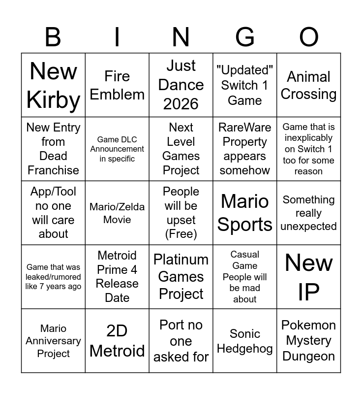 This bingo card has a free space and 24 words: Metroid Prime 4 Release Date, 2D Metroid, Next Level Games Project, Mario Anniversary Project, Animal Crossing, New Kirby, New Entry from Dead Franchise, Fire Emblem, Mario Sports, Platinum Games Project, RareWare Property appears somehow, App/Tool no one will care about, Casual Game People will be mad about, New IP, Game DLC Announcement in specific, Sonic Hedgehog, Something really unexpected, Just Dance 2026, Game that is inexplicably on Switch 1 too for some reason, Mario/Zelda Movie, Pokemon Mystery Dungeon, Game that was leaked/rumored like 7 years ago, "Updated" Switch 1 Game and Port no one asked for.