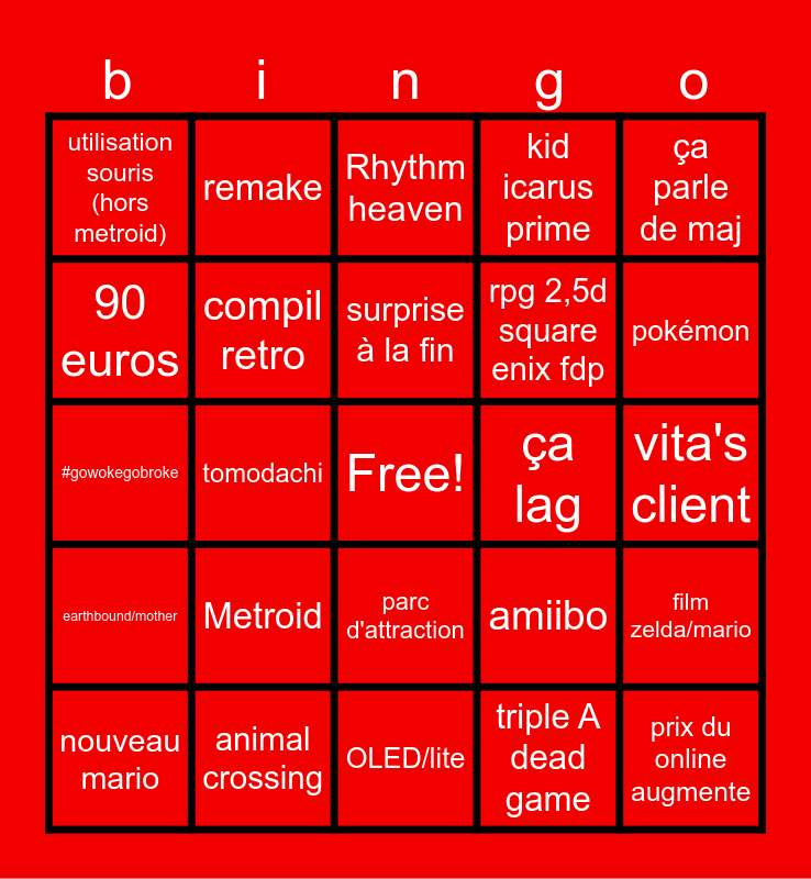 This bingo card has a free space and 24 words: Metroid, animal crossing, surprise à la fin, nouveau mario, ça parle de maj, utilisation souris (hors metroid), 90 euros, remake, ça lag, parc d'attraction, rpg 2,5d square enix fdp, #gowokegobroke, amiibo, film zelda/mario, compil retro, triple A dead game, vita's client, Rhythm heaven, pokémon, tomodachi, prix du online augmente, earthbound/mother, kid icarus prime and OLED/lite.
