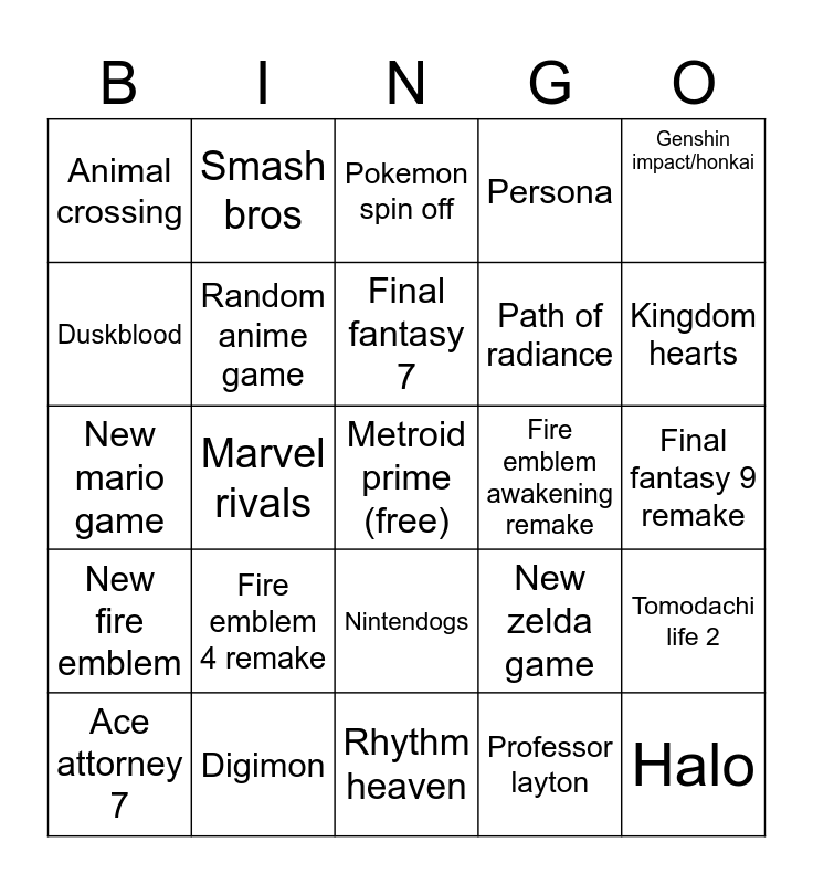 This bingo card has a free space and 24 words: Ace attorney 7, Fire emblem 4 remake, Final fantasy 7, Professor layton, Genshin impact/honkai, Animal crossing, Smash bros, Pokemon spin off, Fire emblem awakening remake, Final fantasy 9 remake, New mario game, Random anime game, New zelda game, Tomodachi life 2, Duskblood, Digimon, Rhythm heaven, Persona, Kingdom hearts, New fire emblem, Marvel rivals, Nintendogs, Path of radiance and Halo.