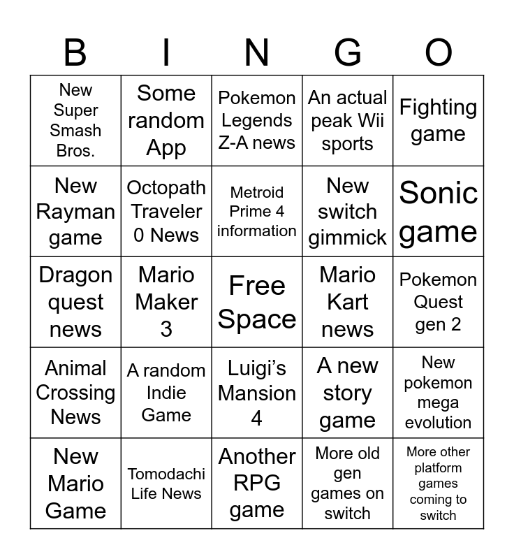 This bingo card has a free space and 24 words: New Mario Game, A random Indie Game, Metroid Prime 4 information, More old gen games on switch, Fighting game, New Super Smash Bros., Some random App, Pokemon Legends Z-A news, Mario Kart news, Pokemon Quest gen 2, Dragon quest news, Octopath Traveler 0 News, A new story game, New pokemon mega evolution, New Rayman game, Tomodachi Life News, Another RPG game, An actual peak Wii sports, Sonic game, Animal Crossing News, Mario Maker 3, Luigi’s Mansion 4, New switch gimmick and More other platform games coming to switch.