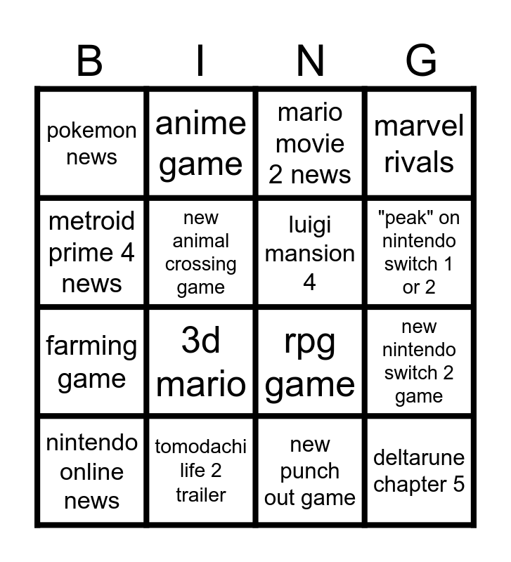 This bingo card has 16 words: tomodachi life 2 trailer, new nintendo switch 2 game, mario movie 2 news, pokemon news, farming game, anime game, rpg game, new punch out game, metroid prime 4 news, new animal crossing game, nintendo online news, marvel rivals, 3d mario, "peak" on nintendo switch 1 or 2, luigi mansion 4 and deltarune chapter 5.