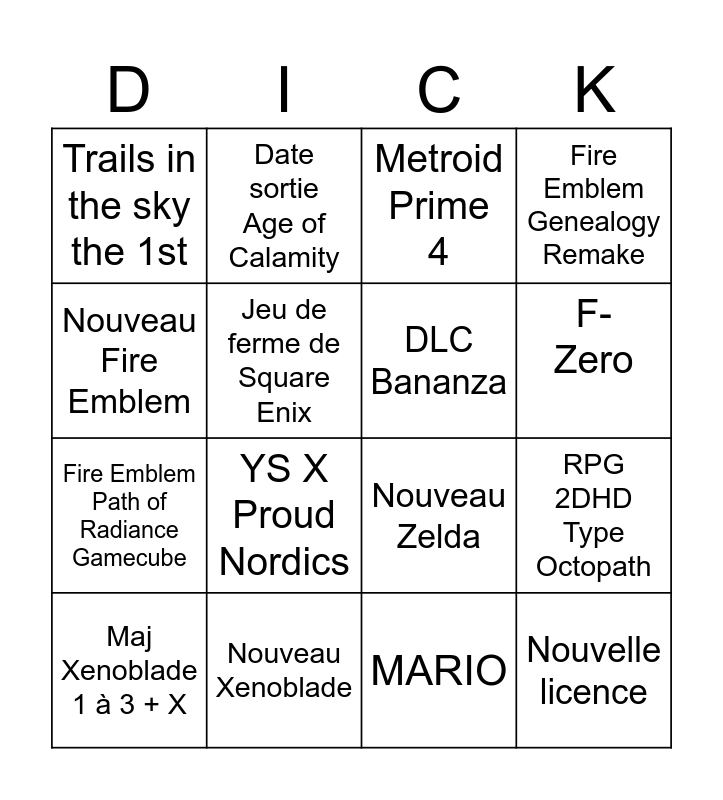 This bingo card has 16 words: Maj Xenoblade 1 à 3 + X, Nouveau Xenoblade, Metroid Prime 4, Fire Emblem Genealogy Remake, Nouveau Fire Emblem, Date sortie Age of Calamity, Nouveau Zelda, RPG 2DHD Type Octopath, Trails in the sky the 1st, Jeu de ferme de Square Enix, MARIO, F-Zero, Fire Emblem Path of Radiance Gamecube, YS X Proud Nordics, DLC Bananza and Nouvelle licence.