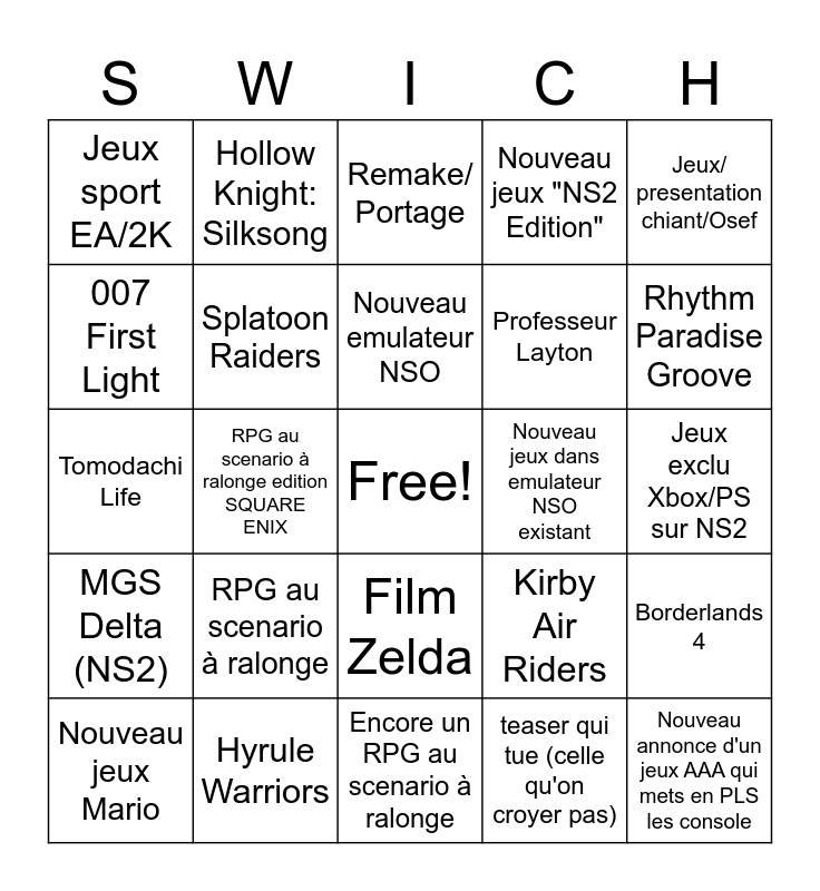 This bingo card has a free space and 24 words: RPG au scenario à ralonge, Hyrule Warriors, Nouveau emulateur NSO, Nouveau jeux Mario, Jeux/ presentation chiant/Osef, Jeux sport EA/2K, 007 First Light, Hollow Knight: Silksong, Nouveau jeux dans emulateur NSO existant, Film Zelda, Professeur Layton, Tomodachi Life, Kirby Air Riders, Borderlands 4, Splatoon Raiders, teaser qui tue (celle qu'on croyer pas), Jeux exclu Xbox/PS sur NS2, Remake/ Portage, Rhythm Paradise Groove, RPG au scenario à ralonge edition SQUARE ENIX, Nouveau annonce d'un jeux AAA qui mets en PLS les console, MGS Delta (NS2), Nouveau jeux "NS2 Edition" and Encore un RPG au scenario à ralonge.