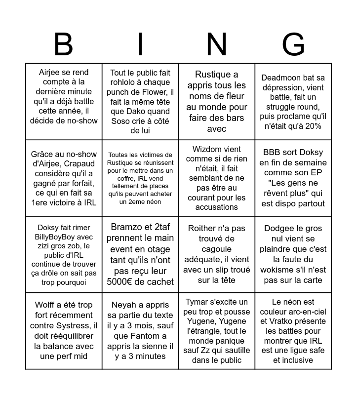 This bingo card has 16 words: Neyah a appris sa partie du texte il y a 3 mois, sauf que Fantom a appris la sienne il y a 3 minutes, Dodgee le gros nul vient se plaindre que c'est la faute du wokisme s'il n'est pas sur la carte, Rustique a appris tous les noms de fleur au monde pour faire des bars avec, Airjee se rend compte à la dernière minute qu'il a déjà battle cette année, il décide de no-show, Doksy fait rimer BillyBoyBoy avec zizi gros zob, le public d'IRL continue de trouver ça drôle on sait pas trop pourquoi, Tout le public fait rohlolo à chaque punch de Flower, il fait la même tête que Dako quand Soso crie à côté de lui, Roither n'a pas trouvé de cagoule adéquate, il vient avec un slip troué sur la tête, Tymar s'excite un peu trop et pousse Yugene, Yugene l'étrangle, tout le monde panique sauf Zz qui sautille dans le public, Grâce au no-show d'Airjee, Crapaud considère qu'il a gagné par forfait, ce qui en fait sa 1ere victoire à IRL, Toutes les victimes de Rustique se réunissent pour le mettre dans un coffre, IRL vend tellement de places qu'ils peuvent acheter un 2eme néon, Wolff a été trop fort récemment contre Systress, il doit rééquilibrer la balance avec une perf mid, Deadmoon bat sa dépression, vient battle, fait un struggle round, puis proclame qu'il n'était qu'à 20%, Bramzo et 2taf prennent le main event en otage tant qu'ils n'ont pas reçu leur 5000€ de cachet, BBB sort Doksy en fin de semaine comme son EP "Les gens ne rêvent plus" qui est dispo partout, Wizdom vient comme si de rien n'était, il fait semblant de ne pas être au courant pour les accusations and Le néon est couleur arc-en-ciel et Vratko présente les battles pour montrer que IRL est une ligue safe et inclusive.