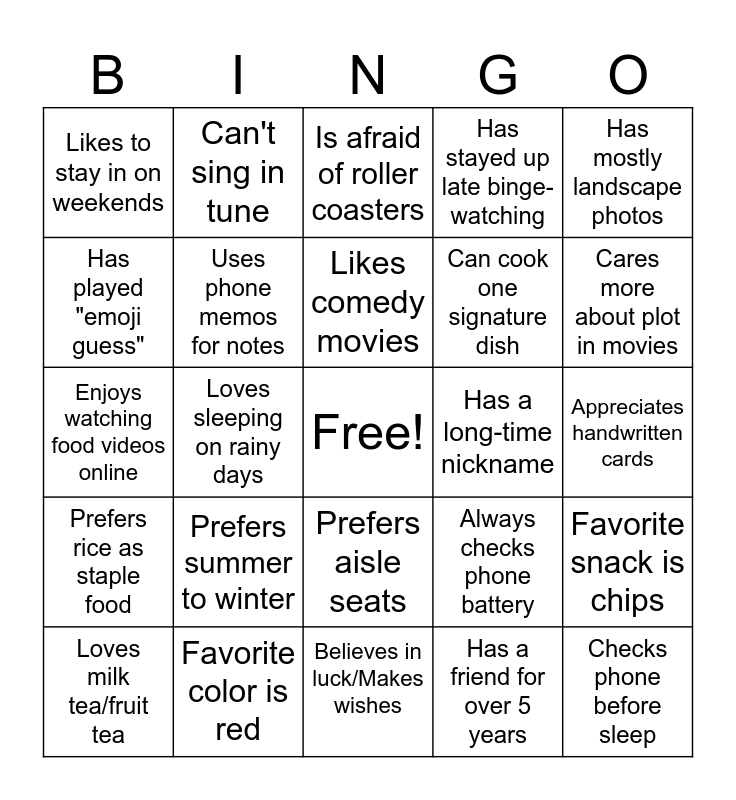 This bingo card has a free space and 24 words: Prefers summer to winter, Favorite color is red, Likes comedy movies, Loves milk tea/fruit tea, Has mostly landscape photos, Likes to stay in on weekends, Has played "emoji guess", Can't sing in tune, Has a long-time nickname, Prefers aisle seats, Can cook one signature dish, Enjoys watching food videos online, Always checks phone battery, Favorite snack is chips, Uses phone memos for notes, Has a friend for over 5 years, Appreciates handwritten cards, Is afraid of roller coasters, Cares more about plot in movies, Loves sleeping on rainy days, Checks phone before sleep, Prefers rice as staple food, Has stayed up late binge-watching and Believes in luck/Makes wishes.