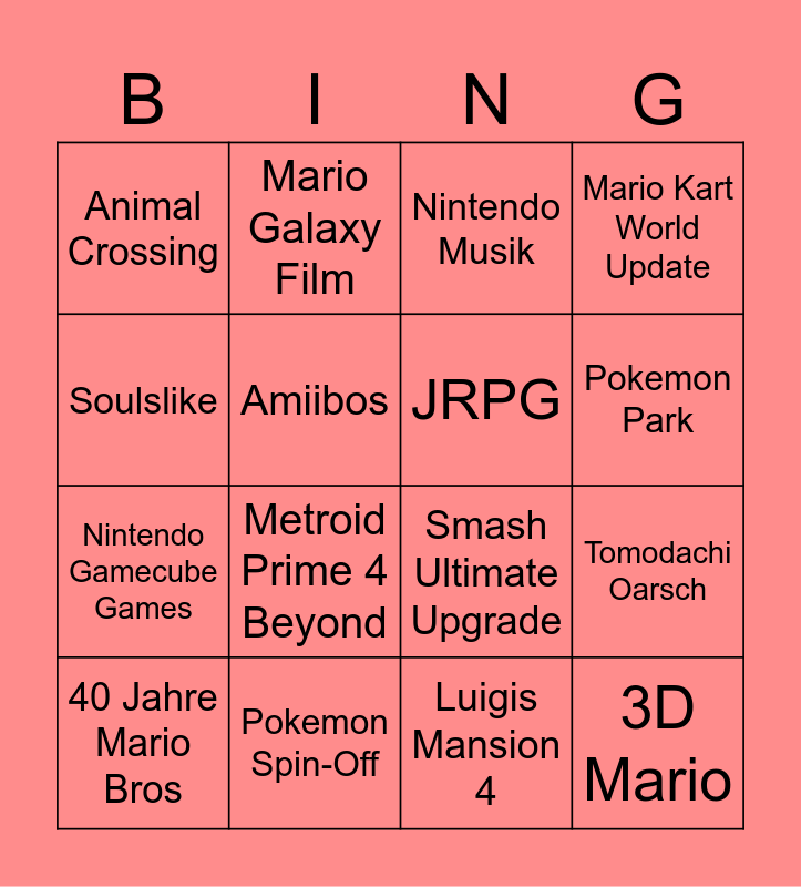 This bingo card has 16 words: Pokemon Spin-Off, Tomodachi Oarsch, Nintendo Musik, Animal Crossing, Nintendo Gamecube Games, Mario Galaxy Film, Smash Ultimate Upgrade, Luigis Mansion 4, Soulslike, Amiibos, 40 Jahre Mario Bros, Mario Kart World Update, Metroid Prime 4 Beyond, Pokemon Park, JRPG and 3D Mario.