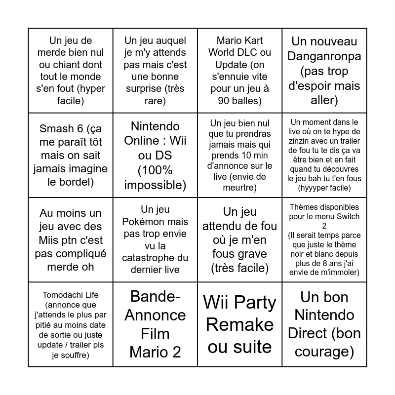This bingo card has 16 words: Tomodachi Life (annonce que j'attends le plus par pitié au moins date de sortie ou juste update / trailer pls je souffre), Bande-Annonce Film Mario 2, Mario Kart World DLC ou Update (on s'ennuie vite pour un jeu à 90 balles), Un nouveau Danganronpa (pas trop d'espoir mais aller), Smash 6 (ça me paraît tôt mais on sait jamais imagine le bordel), Un jeu auquel je m'y attends pas mais c'est une bonne surprise (très rare), Un jeu attendu de fou où je m'en fous grave (très facile), Thèmes disponibles pour le menu Switch 2 (Il serait temps parce que juste le thème noir et blanc depuis plus de 8 ans j'ai envie de m'immoler), Un jeu de merde bien nul ou chiant dont tout le monde s'en fout (hyper facile), Nintendo Online : Wii ou DS (100% impossible), Wii Party Remake ou suite, Un moment dans le live où on te hype de zinzin avec un trailer de fou tu te dis ça va être bien et en fait quand tu découvres le jeu bah tu t'en fous (hyyyper facile), Au moins un jeu avec des Miis ptn c'est pas compliqué merde oh, Un jeu Pokémon mais pas trop envie vu la catastrophe du dernier live, Un jeu bien nul que tu prendras jamais mais qui prends 10 min d'annonce sur le live (envie de meurtre) and Un bon Nintendo Direct (bon courage).
