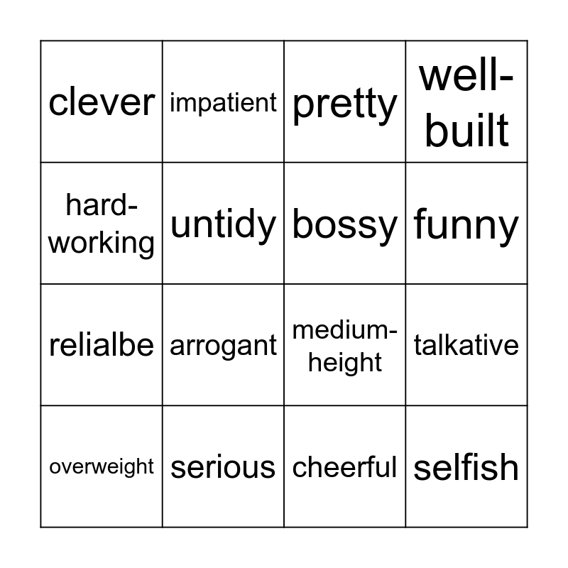 This bingo card has 16 words: serious, talkative, pretty, clever, relialbe, impatient, medium-height, cheerful, hard-working, untidy, overweight, well-built, arrogant, funny, bossy and selfish.