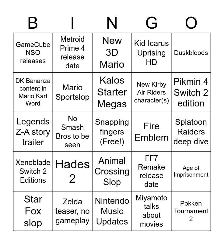 This bingo card has a free space and 24 words: Hades 2, Zelda teaser, no gameplay, Kalos Starter Megas, Star Fox slop, Duskbloods, GameCube NSO releases, DK Bananza content in Mario Kart Word, Metroid Prime 4 release date, Fire Emblem, Animal Crossing Slop, New Kirby Air Riders character(s), Legends Z-A story trailer, FF7 Remake release date, Age of Imprisonment, Mario Sportslop, Miyamoto talks about movies, Splatoon Raiders deep dive, New 3D Mario, Pikmin 4 Switch 2 edition, No Smash Bros to be seen, Pokken Tournament 2, Xenoblade Switch 2 Editions, Kid Icarus Uprising HD and Nintendo Music Updates.