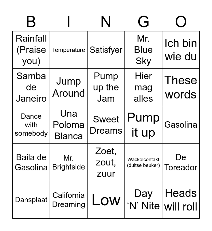 This bingo card has 37 words: Blikkendag, Rasputin, Iβm gonna be (500 miles), Jump Around, De Toreador, Mr. Brightside, Pump up the Jam, Crying at the discotheque, Ich bin wie du, Verliefd zijn, Una Poloma Blanca, Mr. Blue Sky, Sweet Dreams, Gasolina, Samba de Janeiro, Baila de Gasolina, Echte liefde is te koop, Satisfyer, Zoet, zout, zuur, Pump it up, Rainfall (Praise you), These words, Dansplaat, Low, Get Busy, Day βNβ Nite, Temperature, Canβt hold us, Terug in de tijd, Whatever you like, Crazy in Love, California Dreaming, Dance with somebody, Heads will roll, Wackelcontakt (duitse beuker), Hier mag alles and Ushuaia.