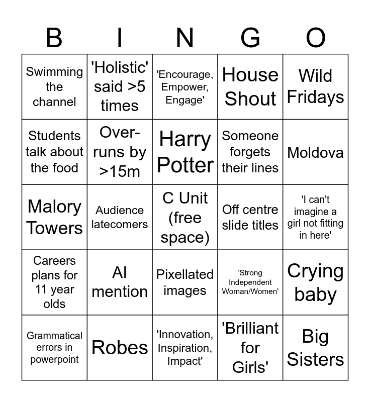 This bingo card has a free space and 24 words: AI mention, Robes, Harry Potter, Grammatical errors in powerpoint, Wild Fridays, Swimming the channel, Students talk about the food, 'Holistic' said >5 times, Off centre slide titles, Pixellated images, Someone forgets their lines, Malory Towers, 'Strong Independent Woman/Women', Crying baby, Over-runs by >15m, 'Brilliant for Girls', 'I can't imagine a girl not fitting in here', 'Encourage, Empower, Engage', Moldova, Audience latecomers, Big Sisters, Careers plans for 11 year olds, House Shout and 'Innovation, Inspiration, Impact'.