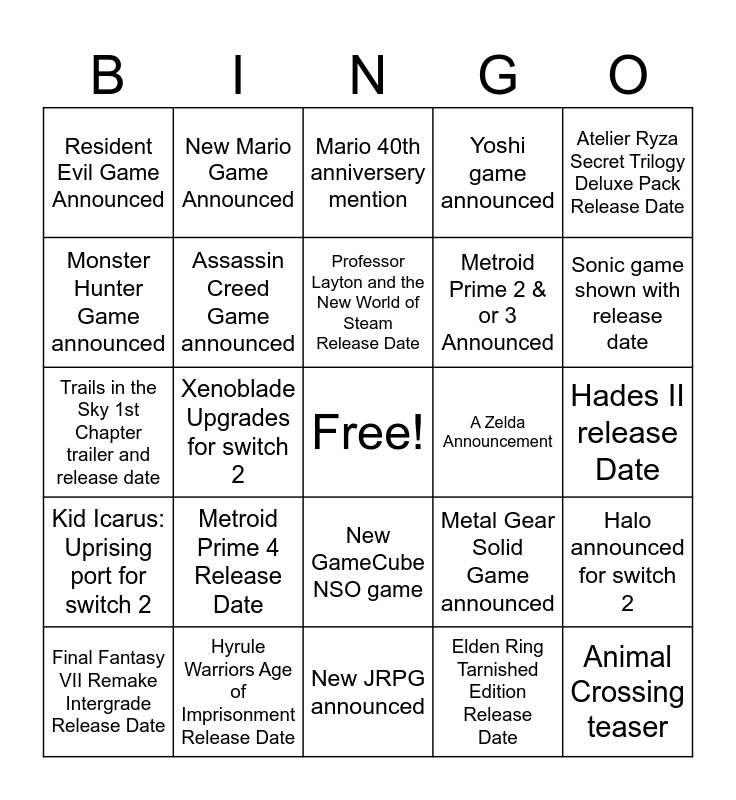 This bingo card has a free space and 24 words: Metroid Prime 4 Release Date, Hyrule Warriors Age of Imprisonment Release Date, Professor Layton and the New World of Steam Release Date, Final Fantasy VII Remake Intergrade Release Date, Atelier Ryza Secret Trilogy Deluxe Pack Release Date, Resident Evil Game Announced, Monster Hunter Game announced, New Mario Game Announced, A Zelda Announcement, New GameCube NSO game, Metroid Prime 2 & or 3 Announced, Trails in the Sky 1st Chapter trailer and release date, Metal Gear Solid Game announced, Halo announced for switch 2, Assassin Creed Game announced, Elden Ring Tarnished Edition Release Date, Hades II release Date, Mario 40th anniversery mention, Sonic game shown with release date, Xenoblade Upgrades for switch 2, Animal Crossing teaser, Kid Icarus: Uprising port for switch 2, Yoshi game announced and New JRPG announced.