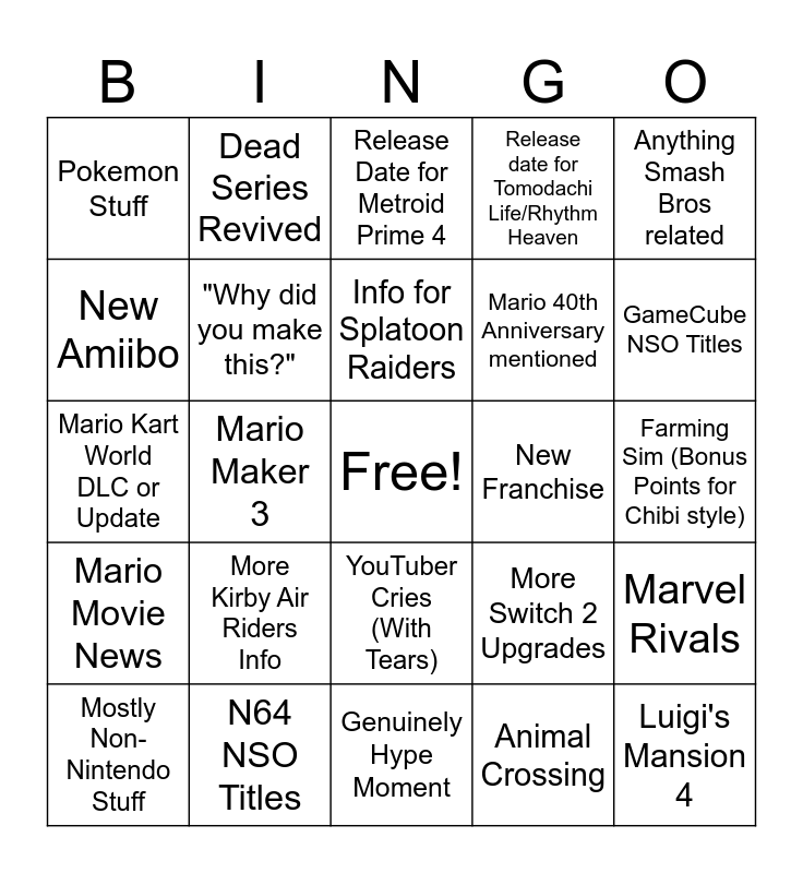 This bingo card has a free space and 24 words: More Kirby Air Riders Info, N64 NSO Titles, Info for Splatoon Raiders, Mostly Non-Nintendo Stuff, Anything Smash Bros related, Pokemon Stuff, New Amiibo, Dead Series Revived, New Franchise, YouTuber Cries (With Tears), Mario 40th Anniversary mentioned, Mario Kart World DLC or Update, More Switch 2 Upgrades, Marvel Rivals, "Why did you make this?", Animal Crossing, Farming Sim (Bonus Points for Chibi style), Release Date for Metroid Prime 4, GameCube NSO Titles, Mario Maker 3, Luigi's Mansion 4, Mario Movie News, Release date for Tomodachi Life/Rhythm Heaven and Genuinely Hype Moment.