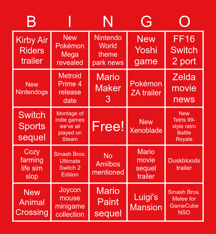 This bingo card has a free space and 24 words: Smash Bros. Ultimate Switch 2 Edition, Joycon mouse minigame collection, Mario Maker 3, New Animal Crossing, FF16 Switch 2 port, Kirby Air Riders trailer, New Nintendogs, New Pokémon Mega revealed, New Xenoblade, No Amiibos mentioned, Pokémon ZA trailer, Switch Sports sequel, Mario movie sequel trailer, Duskbloods trailer, Metroid Prime 4 release date, Luigi's Mansion, New Tetris 99-style retro Battle Royale, Nintendo World theme park news, Zelda movie news, Montage of indie games we've all played on Steam, Smash Bros. Melee for GameCube NSO, Cozy farming life sim slop, New Yoshi game and Mario Paint sequel.