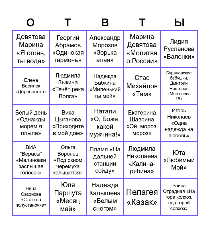 This bingo card has 50 words: Анна Герман «Когда цвели сады», Натали «О, Боже, какой мужчина!», Валентина Легкоступова «Ягода малина», Надежда Кадышева «Белым снегом», Ольга Воронец «Под окном черемуха колышется», Валентина Толкунова «Я не могу иначе», Георгий Абрамов «Одинокая гармонь», Ирина Круг «С праздником, добрые люди!», Елена Василек «Деревенька», Уральский народный хор «Уральская рябинушка», Людмила Зыкина «Течёт река Волга», Марина Девятова «Молитва о России», Юта «Любимый Мой», Людмила Николаева «Калина-рябина», Валерий Сёмин «Ягода-смородина», Надежда Крыгина «Самара-городок», Надежда Бабкина «Миленький ты мой», Екатерина Шаврина «Ой, мороз, мороз», Людмила Сенчина «Лесной олень», Лидия Русланова «Валенки», Вика Цыганова «Приходите в мой дом», Пелагея «Казак», Девятова Марина «Я огонь, ты вода», Стас Михайлов «Там», Михаил Боярский «Ланфрен-ланфра», Раиса Отрадная «На горе колхоз, под горой совхоз», Бурановские бабушки, Дмитрий Нестеров «Мне снова 18», Белый орёл «Потому что нельзя быть на свете красивой такой», Александр Морозов «Зорька алая», Пламя «На дальней станции сойду», Аида Ведищева «Песня про медведей», Самоцветы «Все что в жизни есть у меня», Юрий Антонов «От печали до радости», Татьяна Куртукова «Матушка-земля», Юля Паршута «Месяц май», Татьяна Куртукова «Ромашка-Василёк», «Дарите женщинам цветы», Людмила Гурченко «Пять минут», Николай Рыбников «Старый клён», Игорь Николаев «Одна надежда на любовь», Владимир Ждамиров «А я несу тебе цветы», Афина «Душа кричит», Ярослав Евдакимов «Фантазёр», Мария Пахоменко «Сладка ягода», Нина Сазонова «Стою на полустаночке», Белый день «Однажды морем я плыла», хор Пятницкого «И кто его знает», Олег Митяев «Как здорово!», ВИА "Верасы" «Малиновки заслышав голосок» and Золотое кольцо Антон Зацепин «Широка река».