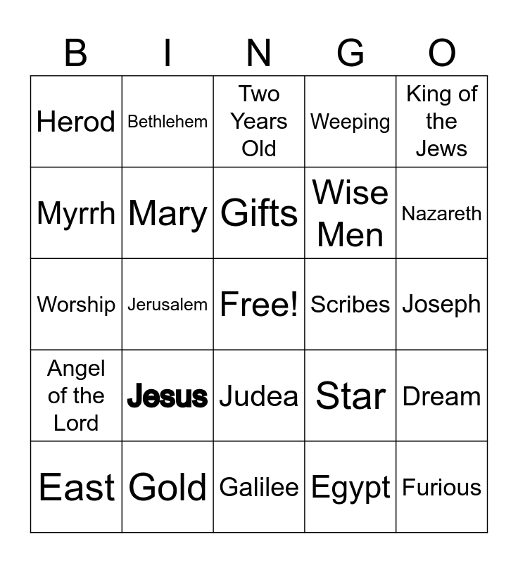 This bingo card has a free space and 24 words: Jesus, Gold, Gifts, East, King of the Jews, Herod, Myrrh, Bethlehem, Scribes, Judea, Wise Men, Worship, Star, Dream, Mary, Egypt, Joseph, Two Years Old, Nazareth, Jerusalem, Furious, Angel of the Lord, Weeping and Galilee.