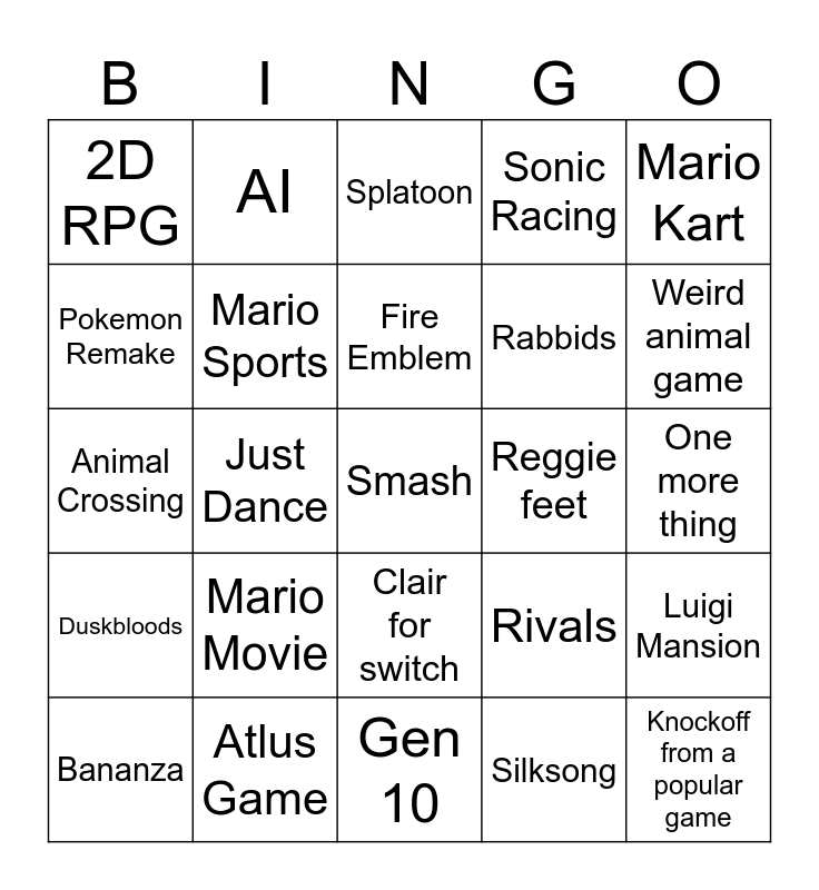 This bingo card has a free space and 24 words: Mario Movie, Atlus Game, Fire Emblem, Bananza, Mario Kart, 2D RPG, Pokemon Remake, AI, Reggie feet, Clair for switch, Rabbids, Animal Crossing, Rivals, Luigi Mansion, Mario Sports, Silksong, One more thing, Splatoon, Weird animal game, Just Dance, Knockoff from a popular game, Duskbloods, Sonic Racing and Gen 10.