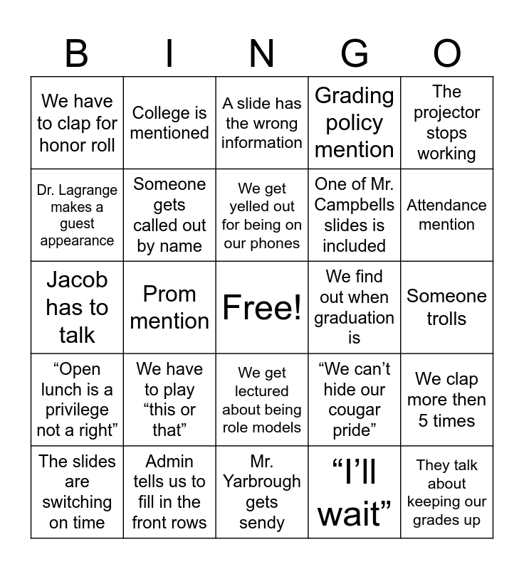 This bingo card has a free space and 24 words: We have to play “this or that”, Admin tells us to fill in the front rows, We get yelled out for being on our phones, The slides are switching on time, The projector stops working, We have to clap for honor roll, Dr. Lagrange makes a guest appearance, College is mentioned, We find out when graduation is, We get lectured about being role models, One of Mr. Campbells slides is included, Jacob has to talk, “We can’t hide our cougar pride”, We clap more then 5 times, Someone gets called out by name, “I’ll wait”, Someone trolls, A slide has the wrong information, Attendance mention, Prom mention, They talk about keeping our grades up, “Open lunch is a privilege not a right”, Grading policy mention and Mr. Yarbrough gets sendy.
