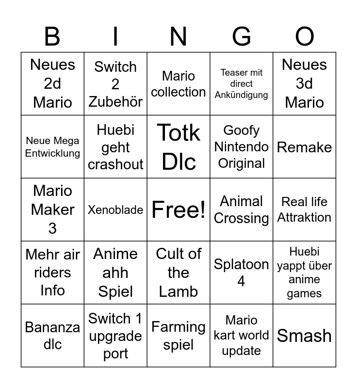 This bingo card has a free space and 24 words: Anime ahh Spiel, Switch 1 upgrade port, Totk Dlc, Bananza dlc, Neues 3d Mario, Neues 2d Mario, Neue Mega Entwicklung, Switch 2 Zubehör, Animal Crossing, Cult of the Lamb, Goofy Nintendo Original, Mario Maker 3, Splatoon 4, Huebi yappt über anime games, Huebi geht crashout, Mario kart world update, Real life Attraktion, Mario collection, Remake, Xenoblade, Smash, Mehr air riders Info, Teaser mit direct Ankündigung and Farming spiel.