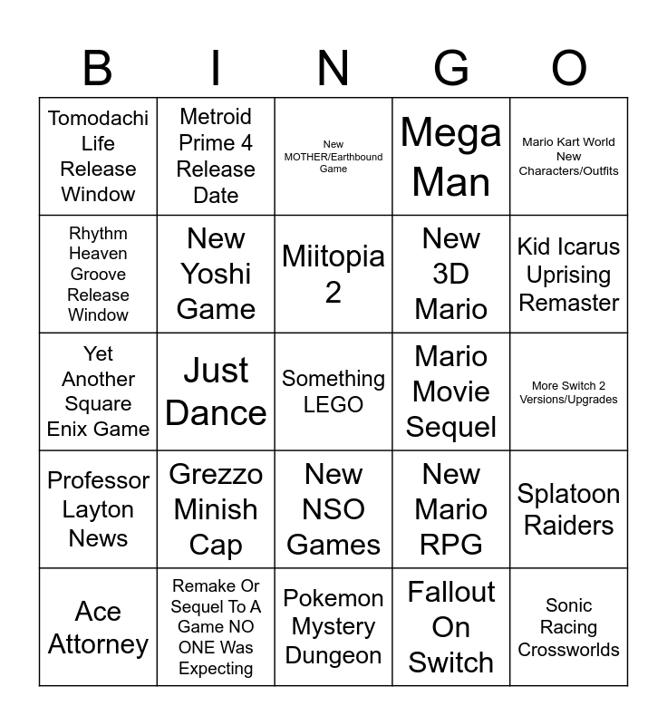 This bingo card has 25 words: Grezzo Minish Cap, Pokemon Mystery Dungeon, Miitopia 2, Ace Attorney, Mario Kart World New Characters/Outfits, Tomodachi Life Release Window, Rhythm Heaven Groove Release Window, Metroid Prime 4 Release Date, Mario Movie Sequel, New NSO Games, New 3D Mario, Yet Another Square Enix Game, New Mario RPG, Splatoon Raiders, New Yoshi Game, Sonic Racing Crossworlds, More Switch 2 Versions/Upgrades, New MOTHER/Earthbound Game, Kid Icarus Uprising Remaster, Just Dance, Something LEGO, Remake Or Sequel To A Game NO ONE Was Expecting, Professor Layton News, Mega Man and Fallout On Switch.