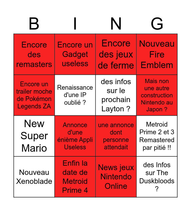 This bingo card has 16 words: Enfin la date de Metroid Prime 4, Metroid Prime 2 et 3 Remastered par pitié !!, Encore des jeux de ferme, Encore des remasters, New Super Mario, Encore un Gadget useless, une annonce dont personne attendait, News jeux Nintendo Online, Encore un trailer moche de Pokémon Legends ZA, Renaissance d'une IP oublié ?, Nouveau Xenoblade, Nouveau Fire Emblem, Annonce d'une énième Appli Useless, Mais non une autre construction Nintendo au Japon ?, des infos sur le prochain Layton ? and des Infos sur The Duskbloods ?.