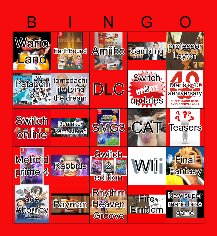This bingo card has 23 images, a free space and 24 words: Rabbids, Rayman, DLC, ace Attorney, professor Layton, Wario Land, Patapon 3, EarthBound, CAT, Switch 2 edition, Switch 2 updates, Switch online, WII, Final Fantasy, tomodachi life living the dream, Fire Emblem, Teasers, Amiibo, Mario's 40 anniversary, Remake/ Remastered, New super mario bros game, Metroid prime 4, Gambling and Rhythm Heaven Groove.