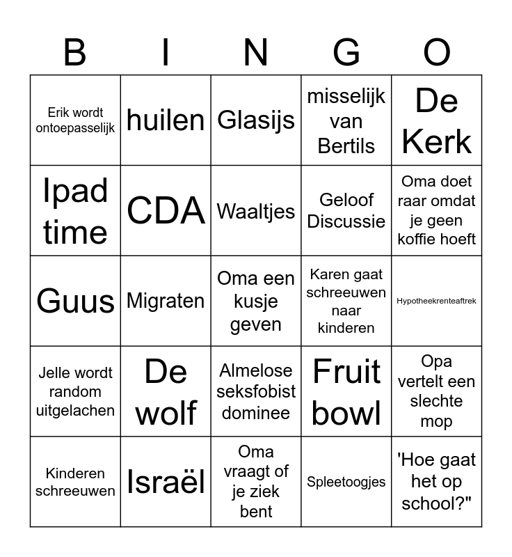 This bingo card has a free space and 24 words: De wolf, Israël, Waaltjes, Kinderen schreeuwen, De Kerk, Erik wordt ontoepasselijk, Ipad time, huilen, Karen gaat schreeuwen naar kinderen, Almelose seksfobist dominee, Geloof Discussie, Guus, Fruit bowl, Opa vertelt een slechte mop, CDA, Spleetoogjes, Hypotheekrenteaftrek, Glasijs, Oma doet raar omdat je geen koffie hoeft, Migraten, 'Hoe gaat het op school?", Jelle wordt random uitgelachen, misselijk van Bertils and Oma vraagt of je ziek bent.