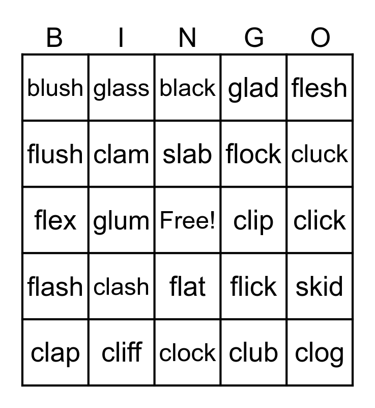 This bingo card has a free space and 29 words: clap, block, glum, blot, blush, black, clam, clash, clip, cliff, click, clog, clock, club, cluck, flag, flat, flash, flesh, flex, flick, flop, flock, flush, glad, glass, skid, slab and plum.