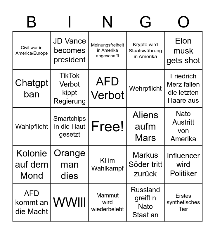 This bingo card has a free space and 24 words: Orange man dies, WWlll, AFD Verbot, AFD kommt an die Macht, Elon musk gets shot, Civil war in America/Europe, Chatgpt ban, JD Vance becomes president, Aliens aufm Mars, KI im Wahlkampf, Wehrpflicht, Wahlpflicht, Markus Söder tritt zurück, Influencer wird Politiker, TikTok Verbot kippt Regierung, Russland greift n Nato Staat an, Nato Austritt von Amerika, Meinungsfreiheit in Amerika abgeschafft, Friedrich Merz fallen die letzten Haare aus, Smartchips in die Haut gesetzt, Erstes synthetisches Tier, Kolonie auf dem Mond, Krypto wird Staatswährung in Amerika and Mammut wird wiederbelebt.
