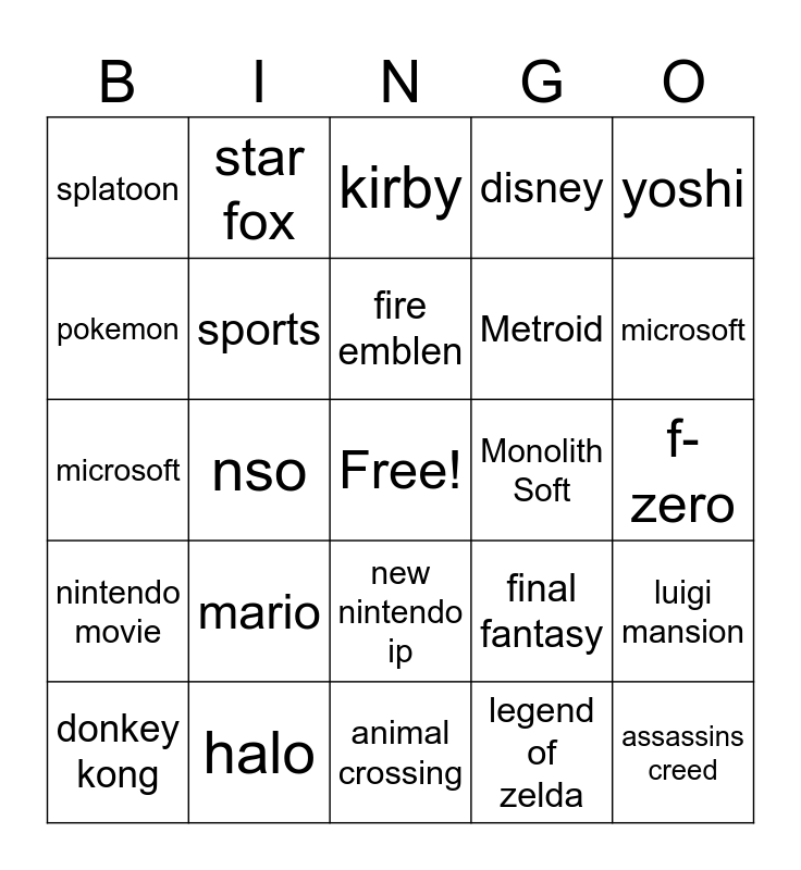 This bingo card has a free space and 24 words: mario, halo, fire emblen, donkey kong, yoshi, splatoon, pokemon, star fox, Monolith Soft, new nintendo ip, Metroid, microsoft, final fantasy, luigi mansion, sports, legend of zelda, f-zero, kirby, microsoft, nso, assassins creed, nintendo movie, disney and animal crossing.