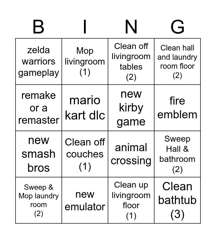 This bingo card has 25 words: new mario game, marvel cosmic, fire emblem, skyrim, remake or a remaster, zelda warriors gameplay, mario kart dlc, Mop livingroom (1), new emulator, fzero, new smash bros, animal crossing, souls like game, star fox, new kirby game, port, Clean up livingroom floor (1), Clean off livingroom tables (2), Clean off couches (1), Sweep Hall & bathroom (2), Sweep & Mop laundry room (2), Wash off washer & dryer (1), Clean bathtub (3), Clean hall and laundry room floor (2) and Dishes (3).