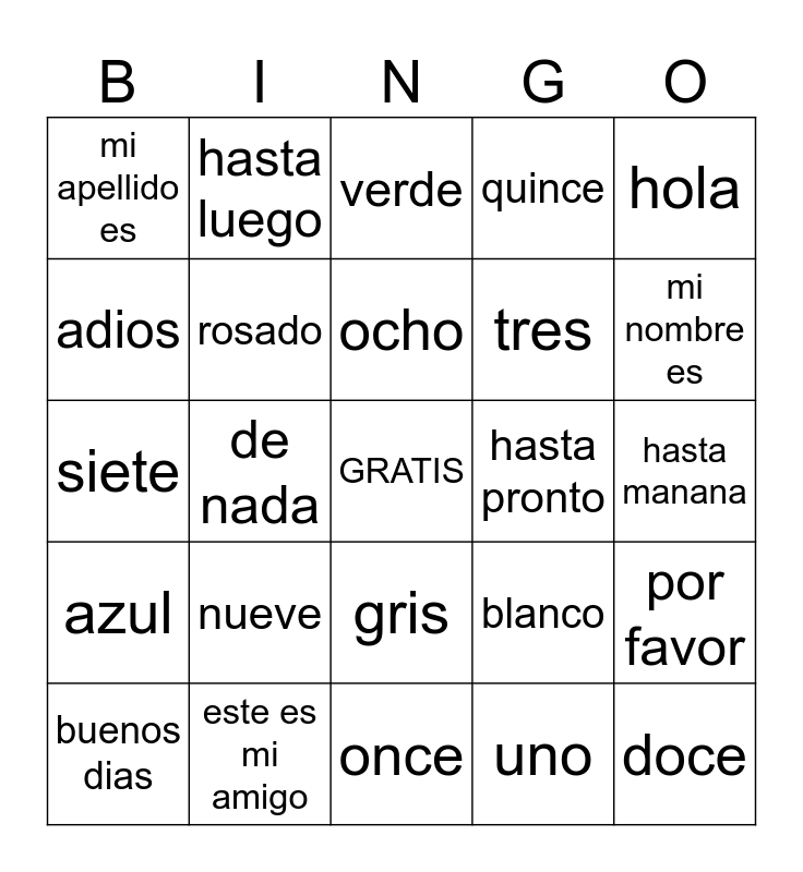This bingo card has a free space and 34 words: rojo, uno, cinco, diez, azul, rosado, hola, buenos dias, hasta luego, dos, ocho, verde, seis, amarillo, hasta pronto, mi nombre es, este es mi amigo, siete, nueve, blanco, gris, cuatro, mi apellido es, hasta manana, once, doce, quince, morado, tres, adios, gracias, de nada, por favor and mucho gusto.