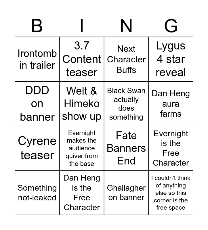 This bingo card has 16 words: Dan Heng is the Free Character, Evernight is the Free Character, Next Character Buffs, Irontomb in trailer, Cyrene teaser, 3.7 Content teaser, Fate Banners End, Ghallagher on banner, DDD on banner, Welt & Himeko show up, Something not-leaked, Lygus 4 star reveal, Evernight makes the audience quiver from the base, Dan Heng aura farms, Black Swan actually does something and I couldn't think of anything else so this corner is the free space.
