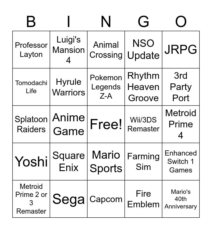 This bingo card has a free space and 24 words: Square Enix, Sega, Pokemon Legends Z-A, Metroid Prime 2 or 3 Remaster, JRPG, Professor Layton, Tomodachi Life, Luigi's Mansion 4, Wii/3DS Remaster, Mario Sports, Rhythm Heaven Groove, Splatoon Raiders, Farming Sim, Enhanced Switch 1 Games, Hyrule Warriors, Fire Emblem, Metroid Prime 4, Animal Crossing, 3rd Party Port, Anime Game, Mario's 40th Anniversary, Yoshi, NSO Update and Capcom.