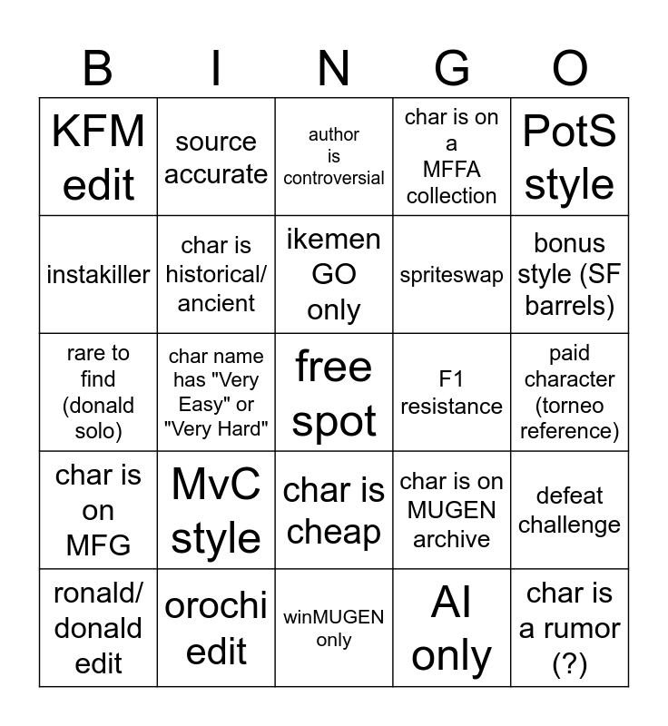 This bingo card has a free space and 24 words: MvC style, orochi edit, ikemen GO only, ronald/ donald edit, PotS style, KFM edit, instakiller, source accurate, F1 resistance, char is cheap, spriteswap, rare to find (donald solo), char is on MUGEN archive, defeat challenge, char is historical/ ancient, AI only, paid character (torneo reference), author is controversial, bonus style (SF barrels), char name has "Very Easy" or "Very Hard", char is a rumor (?), char is on MFG, char is on a MFFA collection and winMUGEN only.
