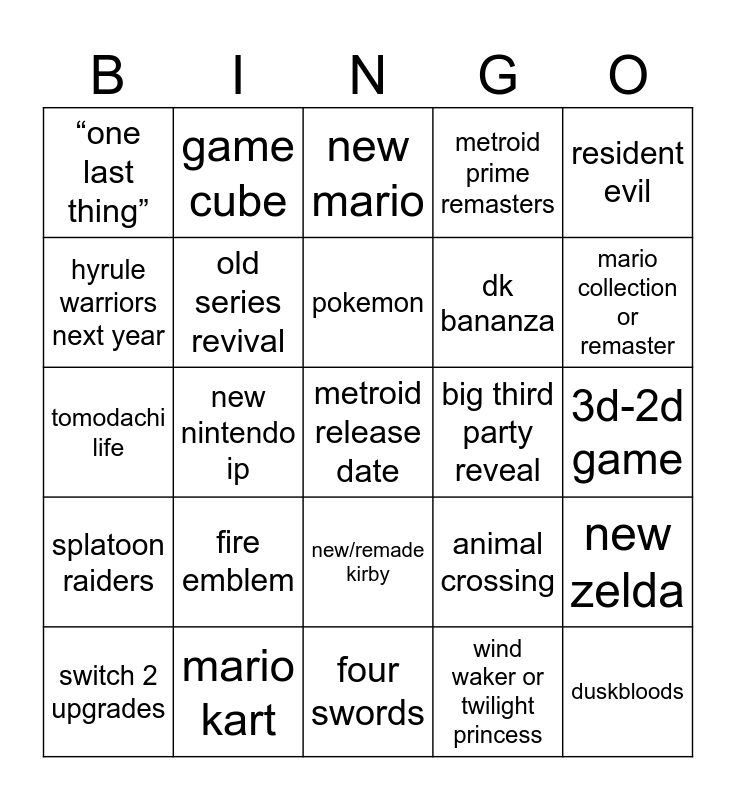 This bingo card has a free space and 24 words: fire emblem, mario kart, pokemon, switch 2 upgrades, resident evil, “one last thing”, hyrule warriors next year, game cube, big third party reveal, new/remade kirby, dk bananza, tomodachi life, animal crossing, new zelda, old series revival, wind waker or twilight princess, 3d-2d game, new mario, mario collection or remaster, new nintendo ip, duskbloods, splatoon raiders, metroid prime remasters and four swords.