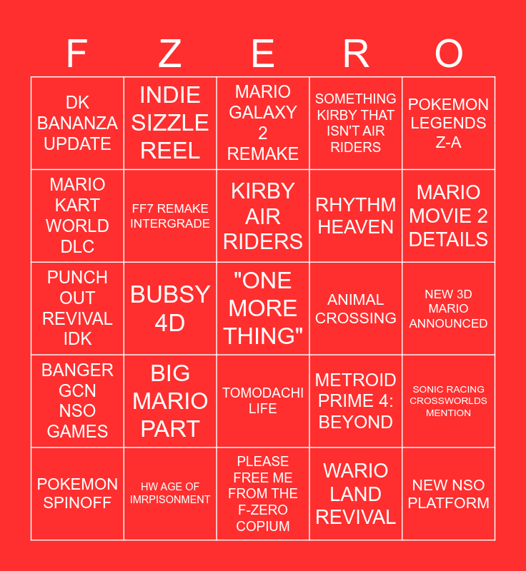 This bingo card has a free space and 24 words: BIG MARIO PART, HW AGE OF IMRPISONMENT, KIRBY AIR RIDERS, POKEMON SPINOFF, POKEMON LEGENDS Z-A, DK BANANZA UPDATE, MARIO KART WORLD DLC, INDIE SIZZLE REEL, ANIMAL CROSSING, TOMODACHI LIFE, RHYTHM HEAVEN, PUNCH OUT REVIVAL IDK, METROID PRIME 4: BEYOND, SONIC RACING CROSSWORLDS MENTION, FF7 REMAKE INTERGRADE, WARIO LAND REVIVAL, NEW 3D MARIO ANNOUNCED, MARIO GALAXY 2 REMAKE, MARIO MOVIE 2 DETAILS, BUBSY 4D, NEW NSO PLATFORM, BANGER GCN NSO GAMES, SOMETHING KIRBY THAT ISN'T AIR RIDERS and PLEASE FREE ME FROM THE F-ZERO COPIUM.