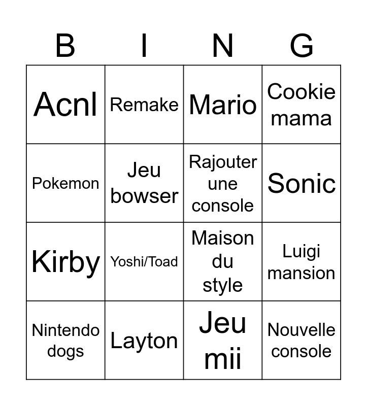 This bingo card has 16 words: Layton, Luigi mansion, Mario, Acnl, Kirby, Remake, Maison du style, Jeu mii, Pokemon, Jeu bowser, Nintendo dogs, Cookie mama, Yoshi/Toad, Sonic, Rajouter une console and Nouvelle console.
