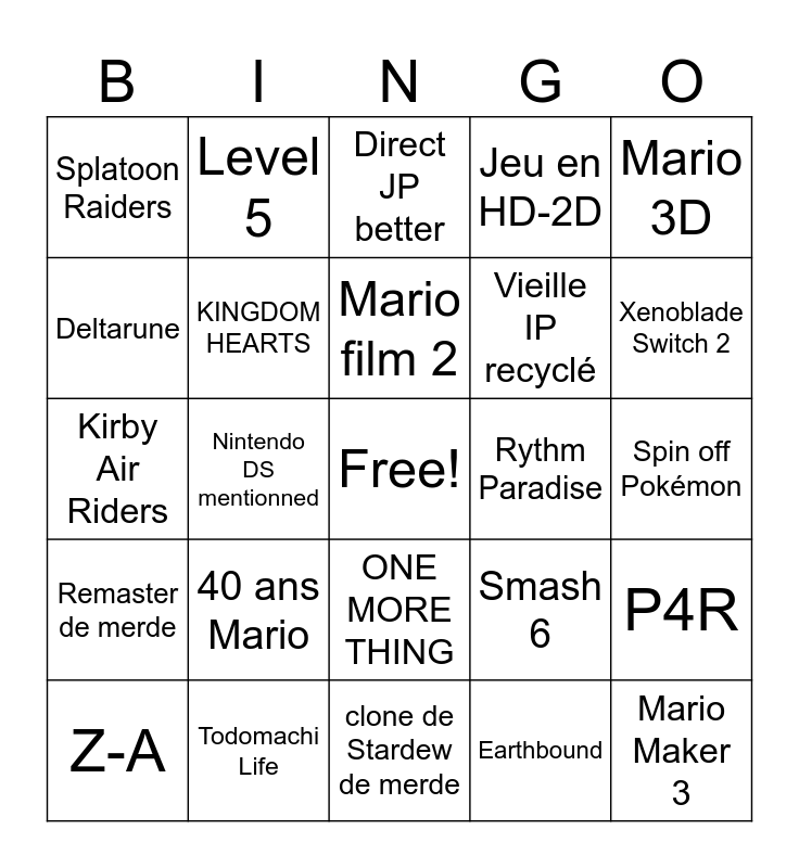 This bingo card has a free space and 24 words: 40 ans Mario, Todomachi Life, Mario film 2, Z-A, Mario 3D, Splatoon Raiders, Deltarune, Level 5, Rythm Paradise, ONE MORE THING, Vieille IP recyclé, Kirby Air Riders, Smash 6, P4R, KINGDOM HEARTS, Earthbound, Spin off Pokémon, Direct JP better, Xenoblade Switch 2, Nintendo DS mentionned, Mario Maker 3, Remaster de merde, Jeu en HD-2D and clone de Stardew de merde.