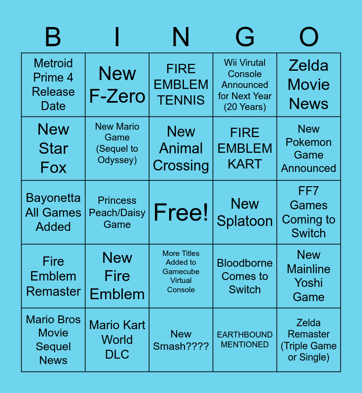 This bingo card has a free space and 24 words: New Fire Emblem, Mario Kart World DLC, New Animal Crossing, Mario Bros Movie Sequel News, Zelda Movie News, Metroid Prime 4 Release Date, New Star Fox, New F-Zero, New Splatoon, More Titles Added to Gamecube Virtual Console, FIRE EMBLEM KART, Bayonetta All Games Added, Bloodborne Comes to Switch, New Mainline Yoshi Game, New Mario Game (Sequel to Odyssey), EARTHBOUND MENTIONED, FF7 Games Coming to Switch, FIRE EMBLEM TENNIS, New Pokemon Game Announced, Princess Peach/Daisy Game, Zelda Remaster (Triple Game or Single), Fire Emblem Remaster, Wii Virutal Console Announced for Next Year (20 Years) and New Smash????.