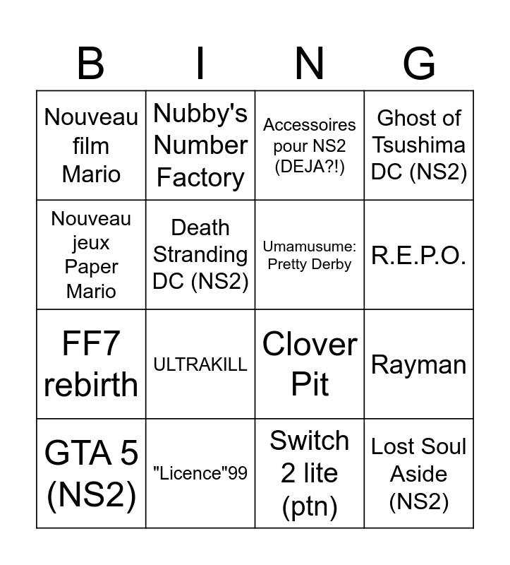 This bingo card has 16 words: "Licence"99, Rayman, Accessoires pour NS2 (DEJA?!), Nouveau film Mario, FF7 rebirth, Nubby's Number Factory, Clover Pit, Switch 2 lite (ptn), Nouveau jeux Paper Mario, Death Stranding DC (NS2), GTA 5 (NS2), Ghost of Tsushima DC (NS2), ULTRAKILL, R.E.P.O., Umamusume: Pretty Derby and Lost Soul Aside (NS2).