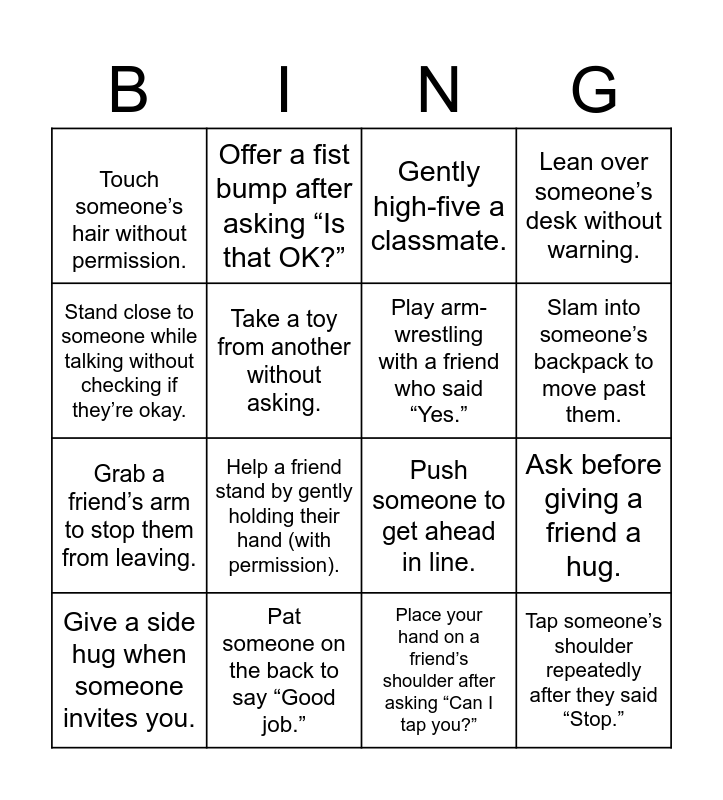 This bingo card has 16 words: Pat someone on the back to say “Good job.”, Ask before giving a friend a hug., Gently high-five a classmate., Touch someone’s hair without permission., Grab a friend’s arm to stop them from leaving., Offer a fist bump after asking “Is that OK?”, Push someone to get ahead in line., Place your hand on a friend’s shoulder after asking “Can I tap you?”, Stand close to someone while talking without checking if they’re okay., Take a toy from another without asking., Give a side hug when someone invites you., Lean over someone’s desk without warning., Help a friend stand by gently holding their hand (with permission)., Slam into someone’s backpack to move past them., Play arm-wrestling with a friend who said “Yes.” and Tap someone’s shoulder repeatedly after they said “Stop.”.