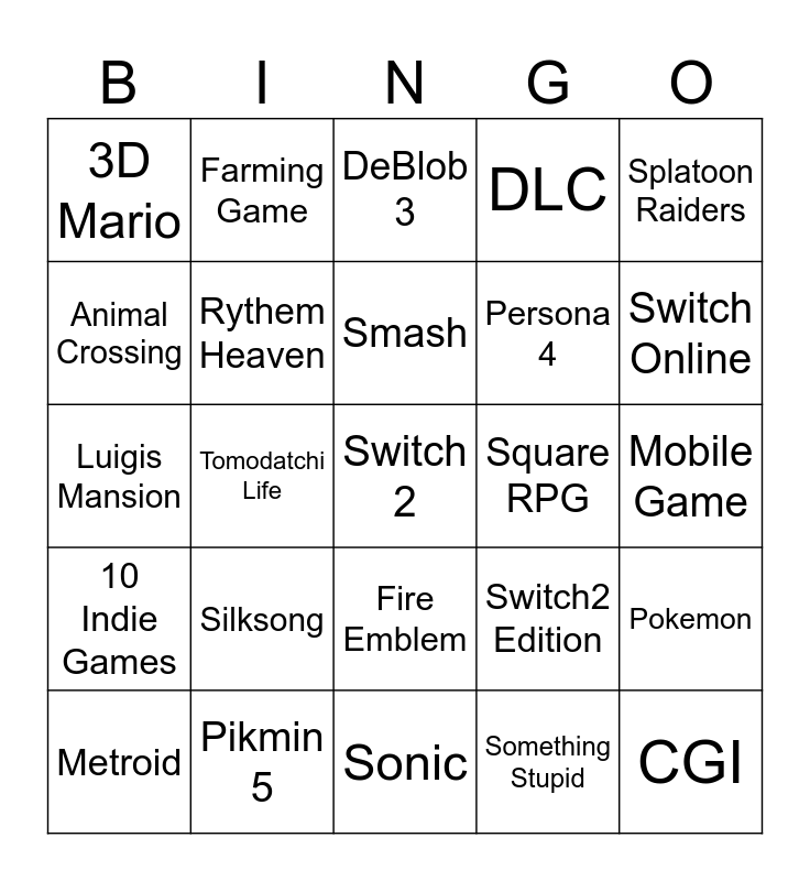 This bingo card has a free space and 24 words: Silksong, Pikmin 5, Smash, Metroid, Splatoon Raiders, 3D Mario, Animal Crossing, Farming Game, Square RPG, Fire Emblem, Persona 4, Luigis Mansion, Switch2 Edition, Pokemon, Rythem Heaven, Something Stupid, Mobile Game, DeBlob 3, Switch Online, Tomodatchi Life, CGI, 10 Indie Games, DLC and Sonic.