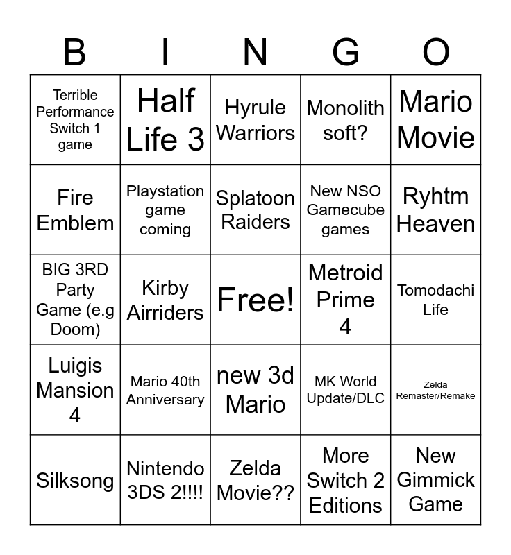 This bingo card has a free space and 24 words: Mario 40th Anniversary, Nintendo 3DS 2!!!!, Splatoon Raiders, Silksong, Mario Movie, Terrible Performance Switch 1 game, Fire Emblem, Half Life 3, Metroid Prime 4, new 3d Mario, New NSO Gamecube games, BIG 3RD Party Game (e.g Doom), MK World Update/DLC, Zelda Remaster/Remake, Playstation game coming, More Switch 2 Editions, Tomodachi Life, Hyrule Warriors, Ryhtm Heaven, Kirby Airriders, New Gimmick Game, Luigis Mansion 4, Monolith soft? and Zelda Movie??.