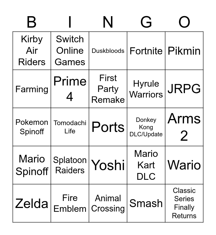 This bingo card has a free space and 24 words: Splatoon Raiders, Fire Emblem, First Party Remake, Zelda, Pikmin, Kirby Air Riders, Farming, Switch Online Games, Donkey Kong DLC/Update, Yoshi, Hyrule Warriors, Pokemon Spinoff, Mario Kart DLC, Wario, Prime 4, Smash, Arms 2, Duskbloods, JRPG, Tomodachi Life, Classic Series Finally Returns, Mario Spinoff, Fortnite and Animal Crossing.