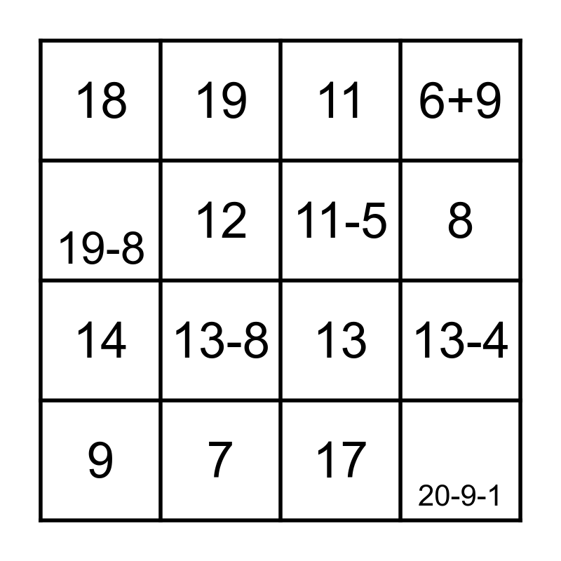 This bingo card has 16 words: 7, 13-4, 11, 18, 14, 19, 13, 17, 19-8, 12, 9, 6+9, 13-8, 8, 11-5 and 20-9-1.