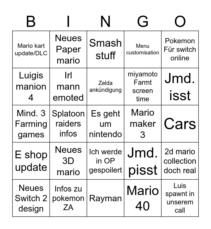 This bingo card has a free space and 24 words: Neues 3D mario, Infos zu pokemon ZA, Zelda ankündigung, Neues Switch 2 design, Pokemon Für switch online, Mario kart update/DLC, Luigis manion 4, Neues Paper mario, Mario maker 3, Ich werde in OP gespoilert, miyamoto Farmt screen time, Mind. 3 Farming games, Jmd. pisst, 2d mario collection doch real, Irl mann emoted, Mario 40, Cars, Smash stuff, Jmd. isst, Splatoon raiders infos, Luis spawnt in unserem call, E shop update, Menu customisation and Rayman.